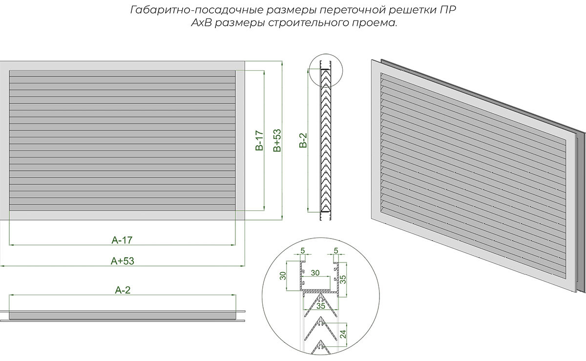 Решетка ПР состоит из двух рам – наружной и внутренней. В внутренней раме неподвижно закреплены V-образные горизонтальные жалюзи, препятствующие обзору сквозь решетку. Наружная рама изготовлена из алюминиевого профиля в виде прямоугольной рамы без жалюзи. Наружная рама устанавливается в дверной или стенной проем, а внутренняя рама устанавливается с противоположенной стороны. Размеры рам (глубина) позволяют устанавливать решетку на дверях или тонких перегородках толщиной от 26 до 50 мм.