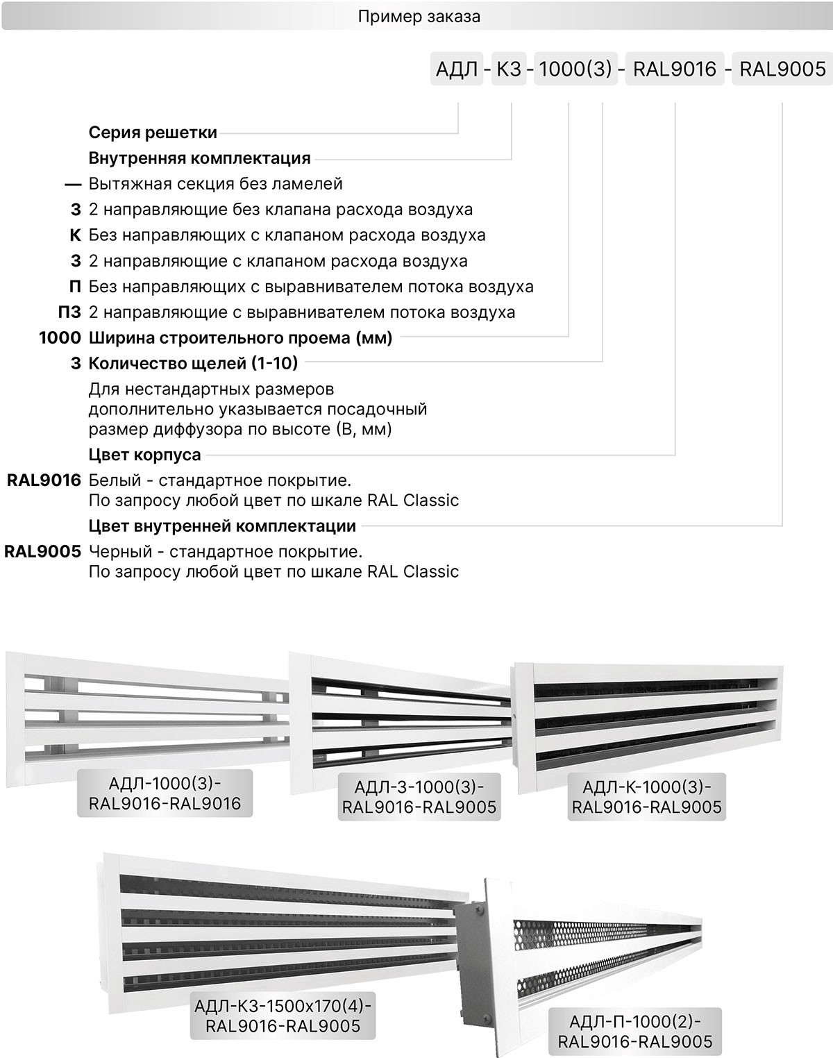 Щелевые решетки серии АДЛ-КЗ изготавливаются из экструдированного алюминиевого профиля АД31 по ГОСТ 22233-2001. По умолчанию корпус диффузоров окрашивается в стандартный белый цвет RAL 9016, а внутренняя перфорированная кассета и ламели в чёрный цвет RAL 9005. По индивидуальному заказу возможна окраска в любой цвет по шкале RAL как корпуса, так и внутренней части.